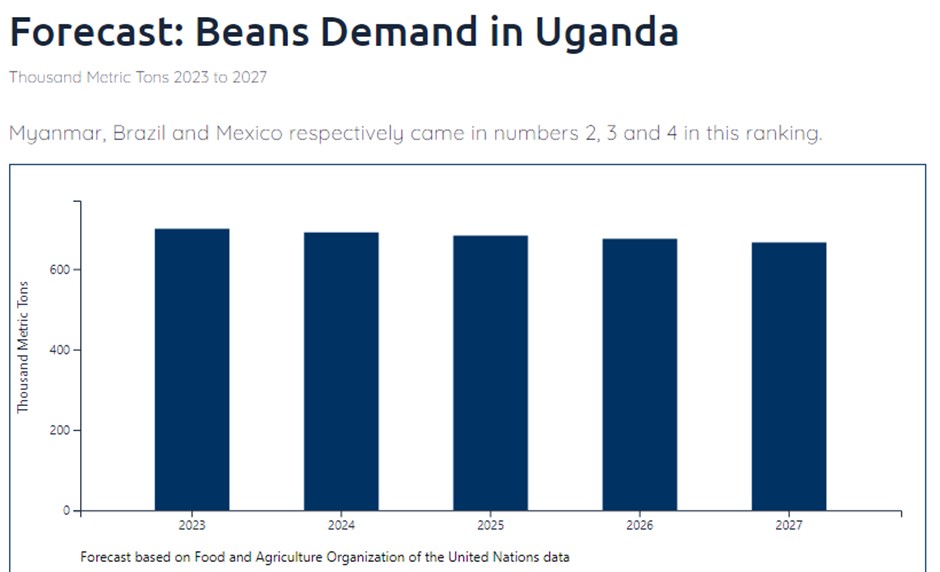 Ugandan bean consumption is set to reach 615,000 metric tons by 2026, a 1% decrease from 2021's 653,000 metric tons. Since 2017, Ugandan demand for beans has grown by 0.2% each year. In 2021, the country was ranked number 6 in bean consumption, with Tanzania coming in at number 5 with 653,000 metric tons. Brazil, Mexico, and the United States were the top three consuming countries, respectively